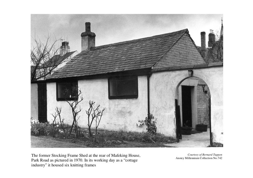 Brian Kibble Replies: The long-stapled wool used for knitting the socks was from local sheep according to the late Howard Bosworth – secretary of the Leicester Chamber of Commerce and choir master of the Anstey Methodist Church. Sadly, the only known knitting frame house in the grounds of Mafeking House, Park Road was recently demolished – the attached picture taken in 1970 shows the building with modernised windows and stucco cladding – this once housed five knitting frames.
